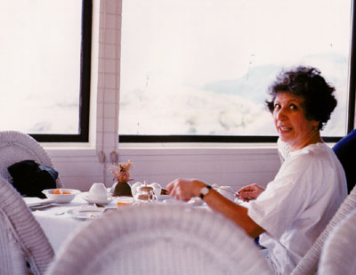 The dining room has the same spectacular view of the Paine massif as the guest rooms; here's Vida enjoying breakfast on our first morning at the hotel.